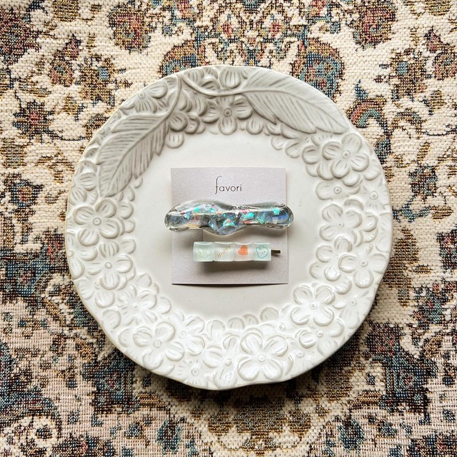 〝favori hair accessory“ 子供の頃キラキラしたものが好きだった シール交換をした懐かしいあの頃を思い出すような作品 ▫️種類について ・クリップピン ・アンティークピン 2点セット アレルギー対応ではございません。 ご注意下さい。 ▫️サイズ 着用画像を参照ください ▫️素材 ガラスタイル アレルギー対応レジン ミラーパウダー ⚠︎注意事項 よくお読みください ・はじめに案内をご一読ください↓ https://minne.com/items/30288472 ・購入後のキャンセルはできません。 御希望やご相談がある場合、メッセージでのやりとり後のご購入をお願いします。 ・美濃焼きタイルは職人さんが心を込めて焼いています。風合いや、タイルの色、模様が1つ1つ異なります。 ご理解いただき、ご購入をお願いします。 ・レジンは専門機関において試験を行ない肌や皮膚等に接触するアクセサリ製品として安全にご使用頂ける製品を使用しています。 肌の弱い方など人によってはアレルギー反応を起こす場合もありますので、不安がある場合は事前にパッチテストなどを行うことをお勧めします。 ・繊細な商品です。不用意に力を入れたりされませんよ うご注意ください。 ・複数購入の場合、専用ページを作成いたしますので一度メッセージをいただきますようお願い致します。 ✳︎配送について✳︎ 配送は商品が壊れないよう、定形外の小さな段ボールにて大切にお包み致します。 ▫️送料 3000円以上で無料とさせていただきます。まとめ買いの場合はメッセージを送っていただくようお願いします。その後、専用ページを作らせていただきます。 ▫️ラッピング 希望者のみラッピングを無料で行わせていただきます。 ご希望の方はメッセージにてお申し付けくださいませ。 ラッピング内容はこちらから↓ https://minne.com/items/30460056 ------------------ はじめまして◎ ハンドメイド作家のfavoriです。 タイルのぷっくりとした可愛さや色味に一目惚れし、タイルのかわいさを広めたいと思い製作をしています。 日本の伝統を現代にも引き継いでいきたい、 そんな一心で岐阜の美濃焼きタイルを使った温かみのあるアクセサリーをデザインしています。 現代にも沢山の方に美濃焼きを愛されて欲しいです。 "favori" の由来 「今日はあのお気に入りをつけていこう」 貴方のお気に入りの一品であれるような、そんな意味を込めてます。 誰かの好きであれるよう、、、